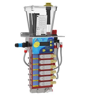 Jednostka centralna zarządza układem dozującym — do systemu można podłączyć do 6 modułów dozujących składających się z mini‑pomp pneumatycznych o regulowanej dawce (0 ÷ 30 mm³) oraz baz mieszających, w których następuje połączenie oleju z powietrzem.